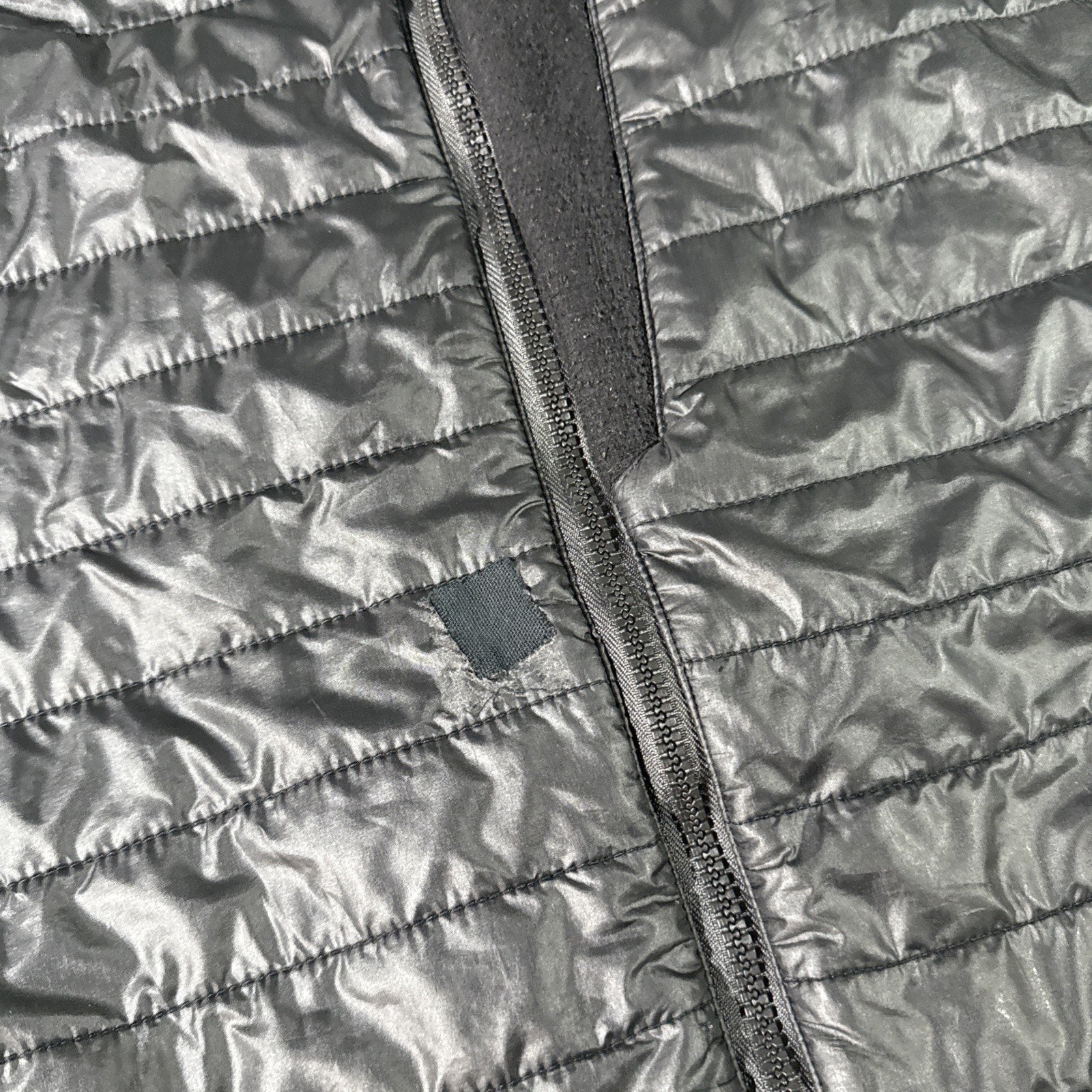 Pre-owned. In good functional condition with two visible patch repairs on the front (shown in photos). Zipper works smoothly, interior and cuffs are clean, and insulation is still lofty. No odors or major stains.