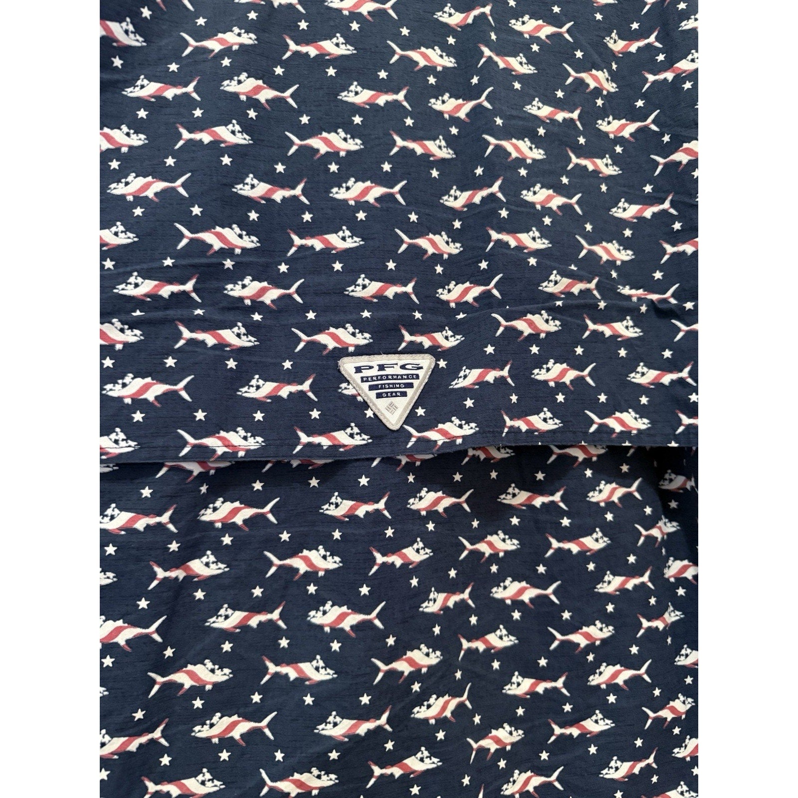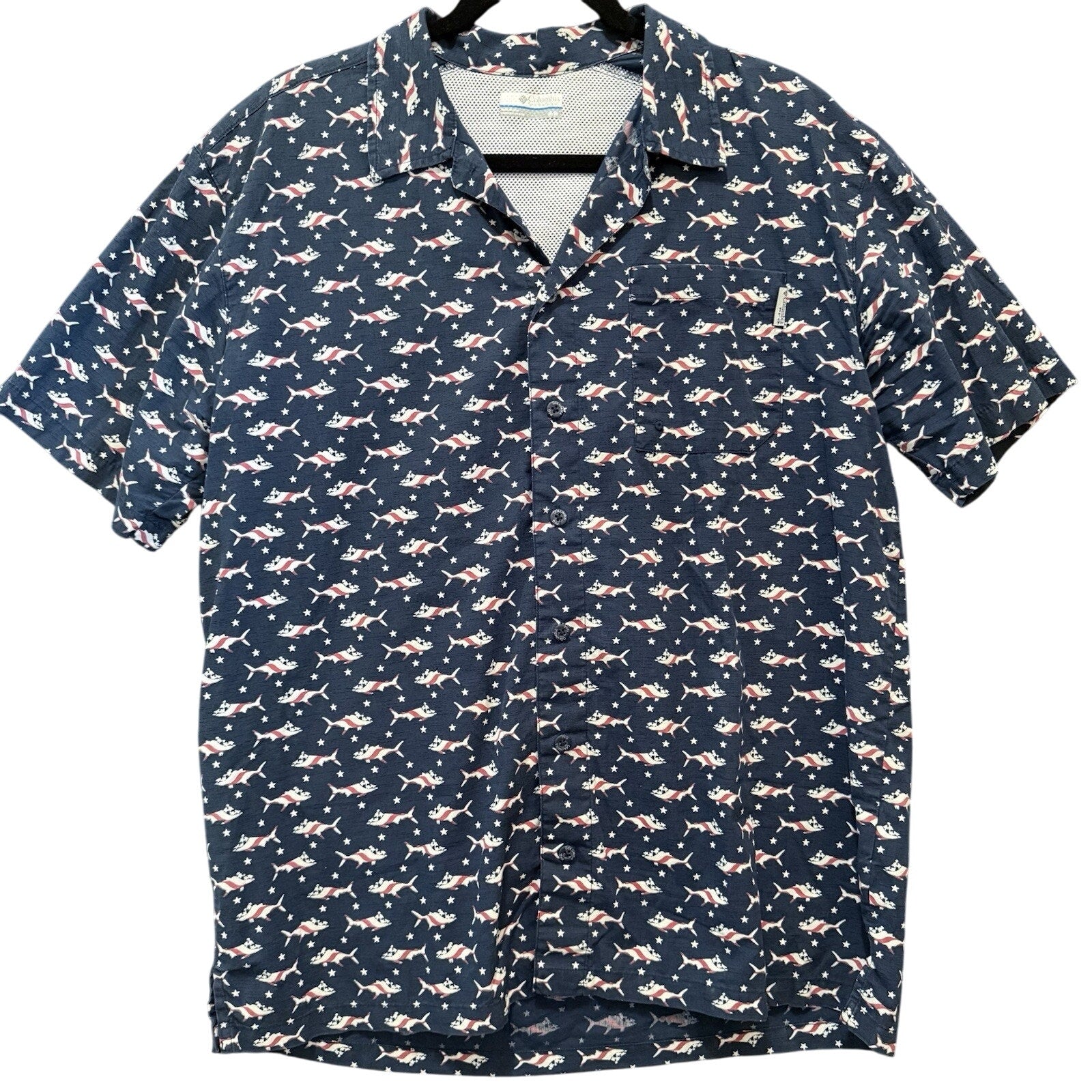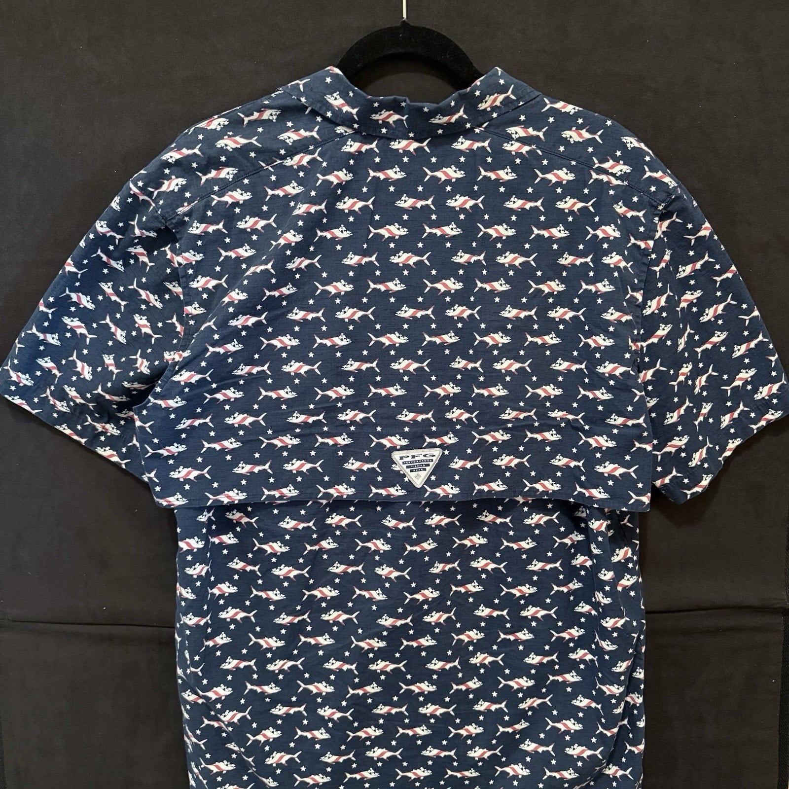 Columbia PFG Short Sleeve Fishing Shirt Blue w/Paint Tuna & Stars Men’s Large