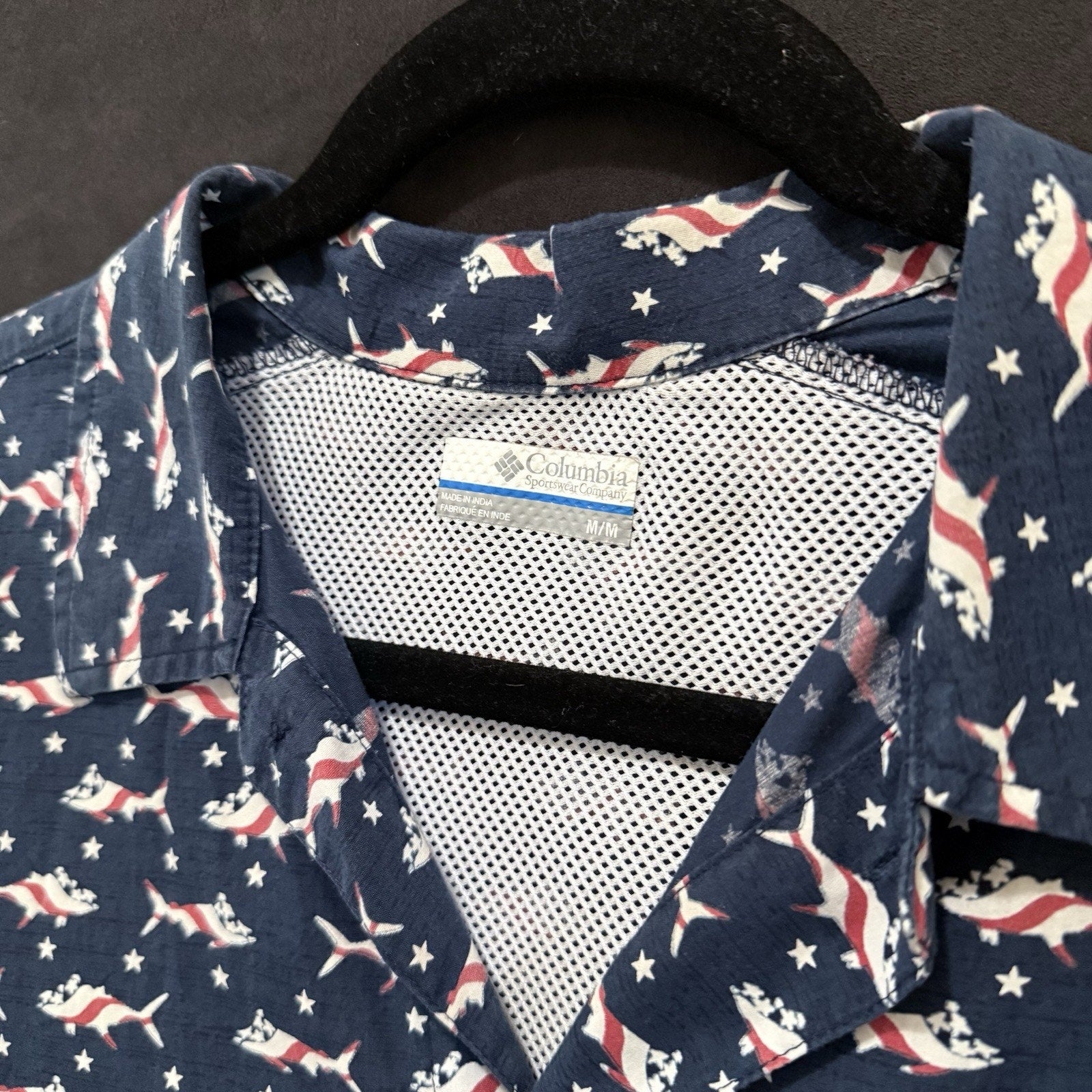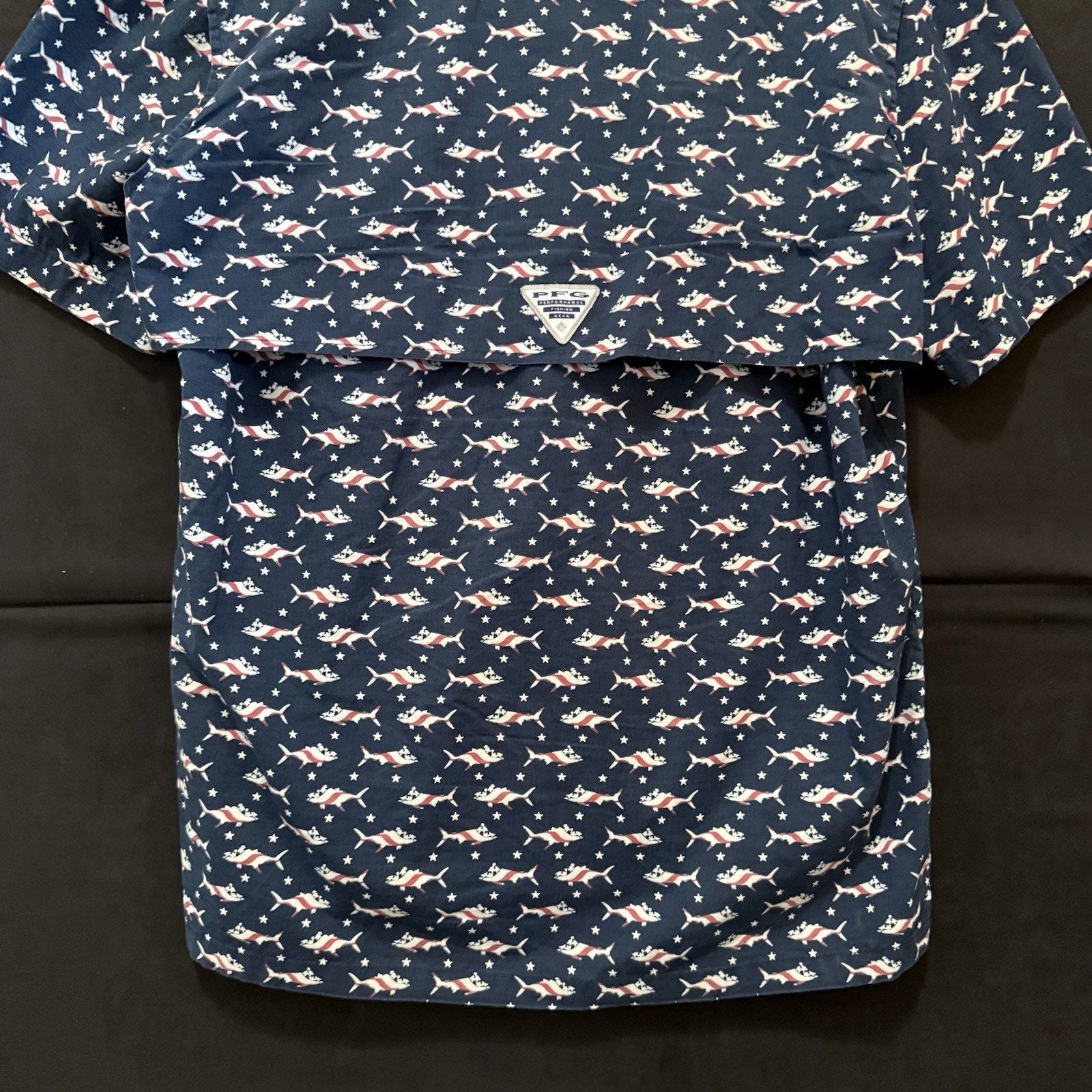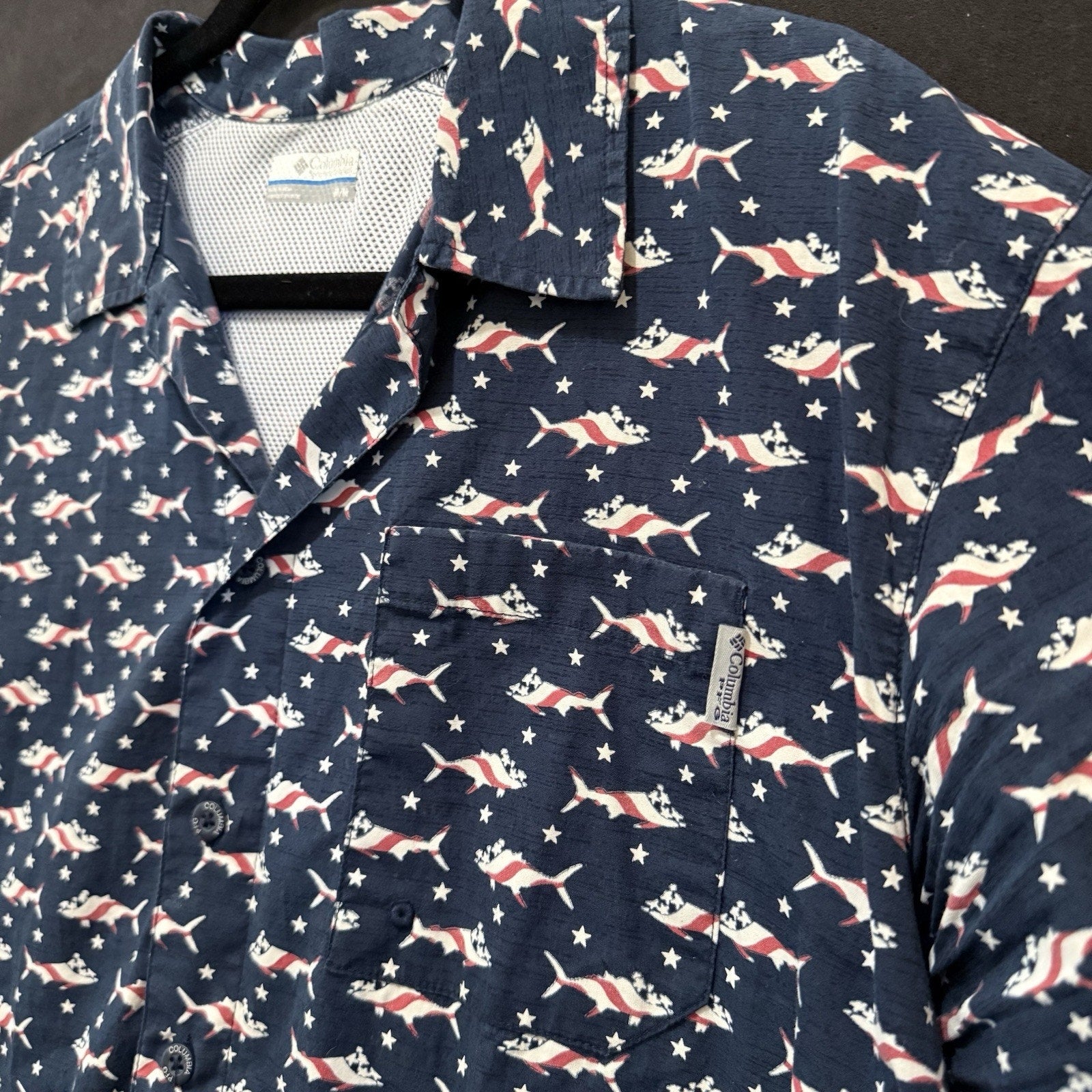 Columbia PFG Short Sleeve Fishing Shirt Blue w/Paint Tuna & Stars Men’s Large
