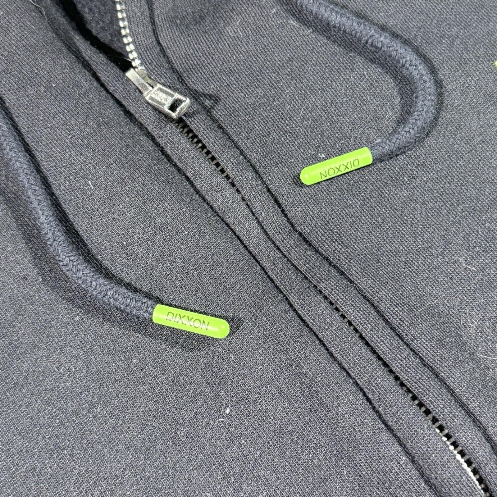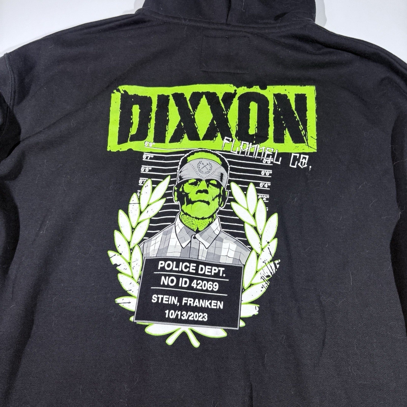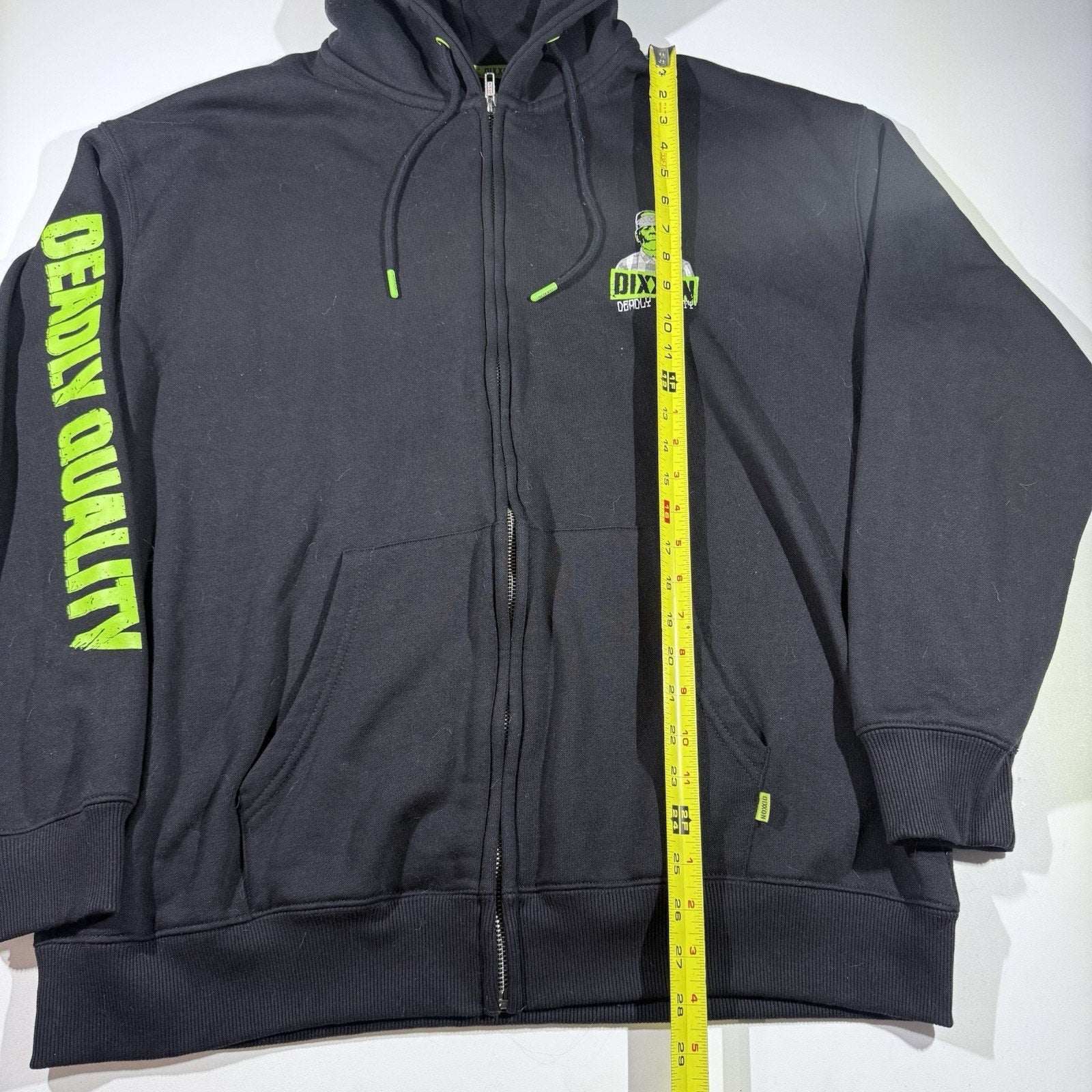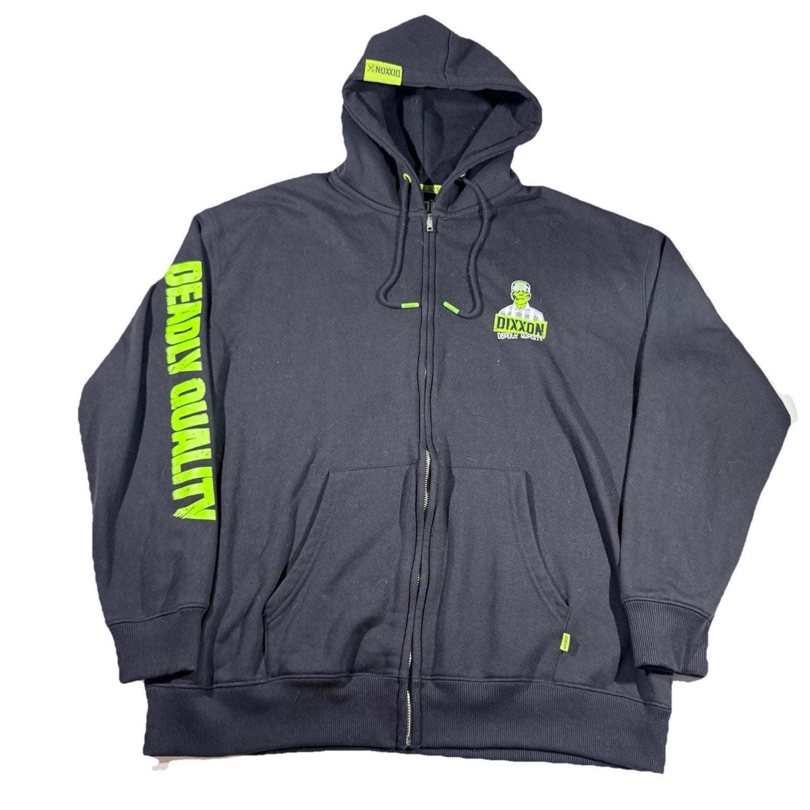 Rare Dixxon Flannel Co. “Deadly Quality” Zip-Up Hoodie in size XL. Features neon green Frankenstein mugshot graphic on the back, matching chest print, and bold DEADLY QUALITY spell-out down the sleeve. High-demand collectible style.