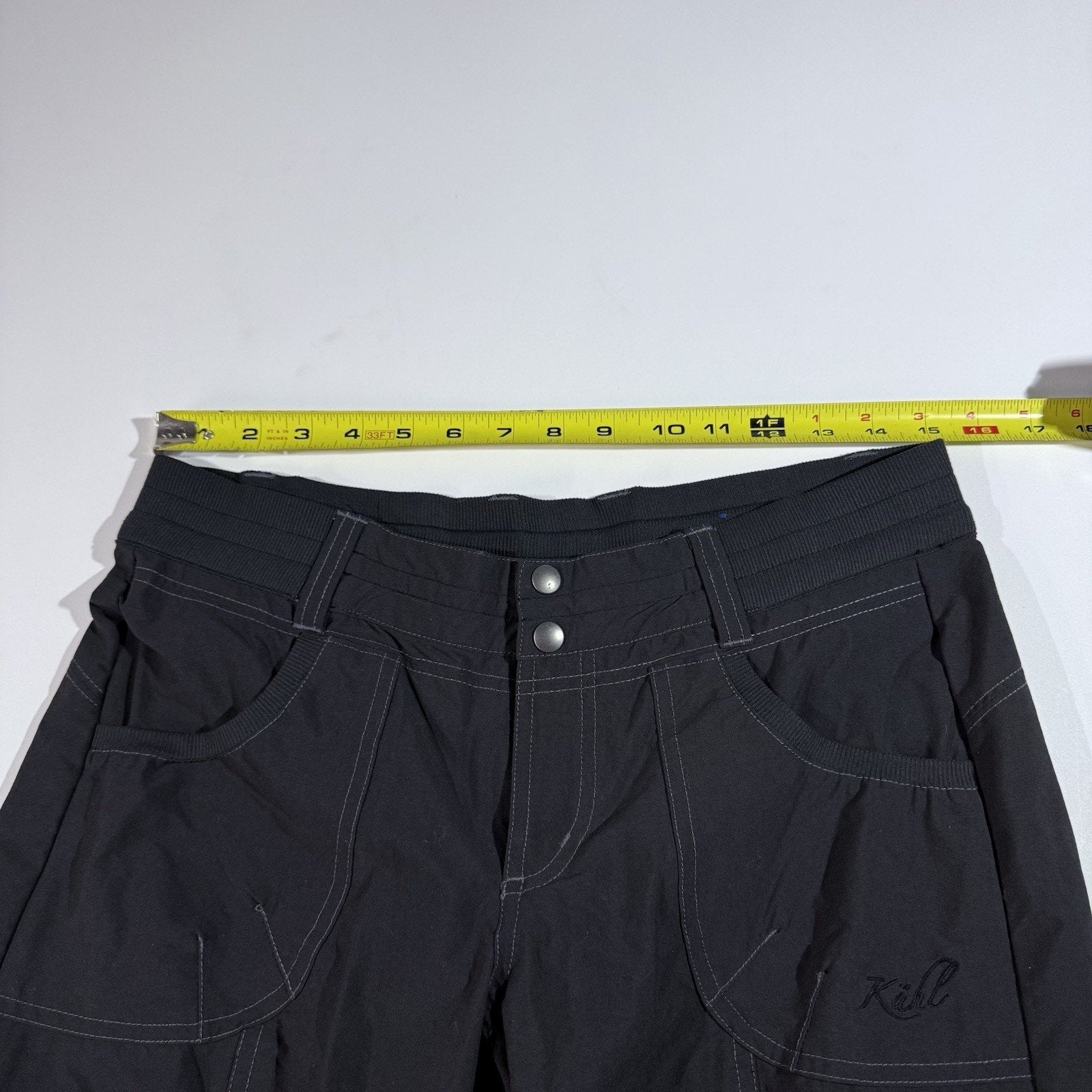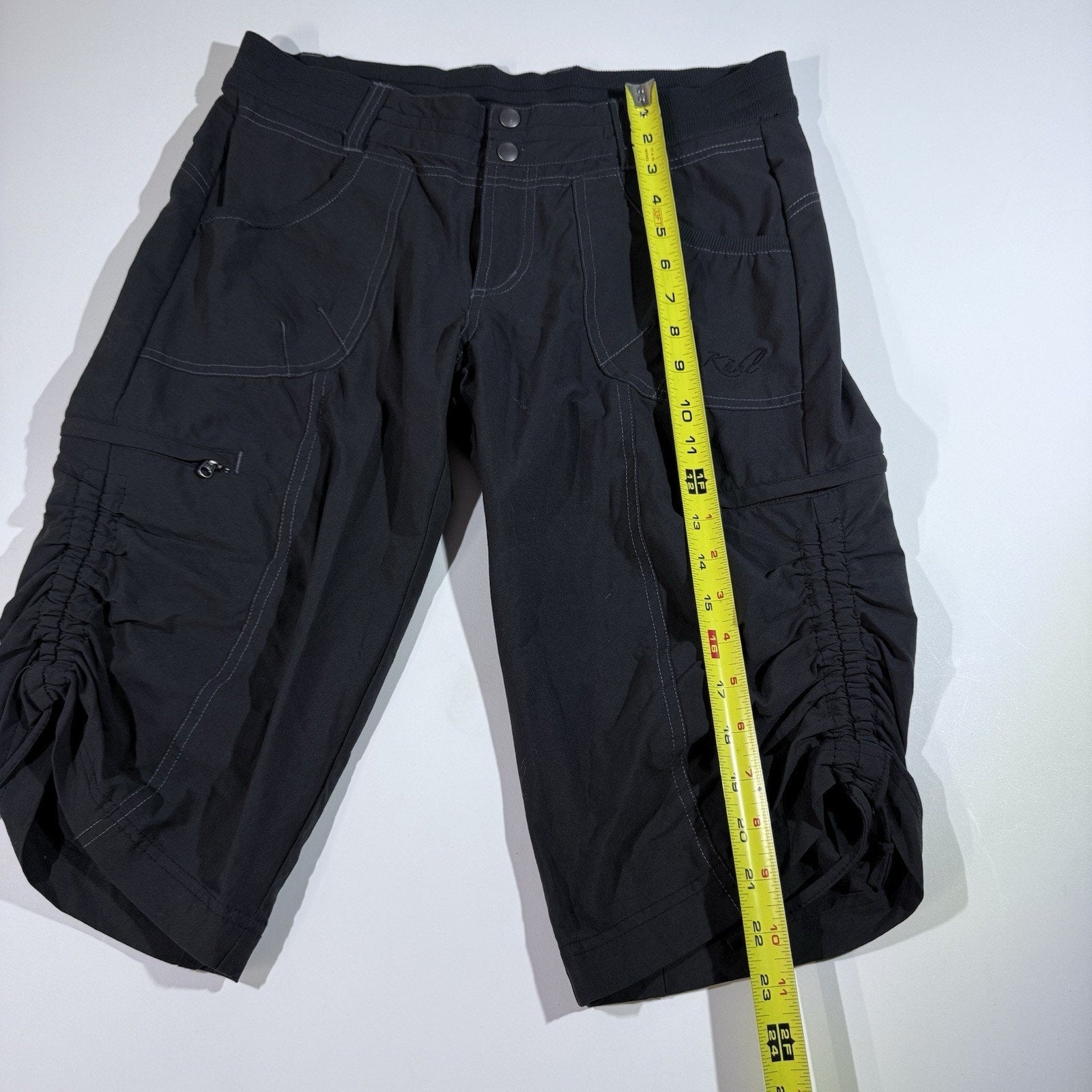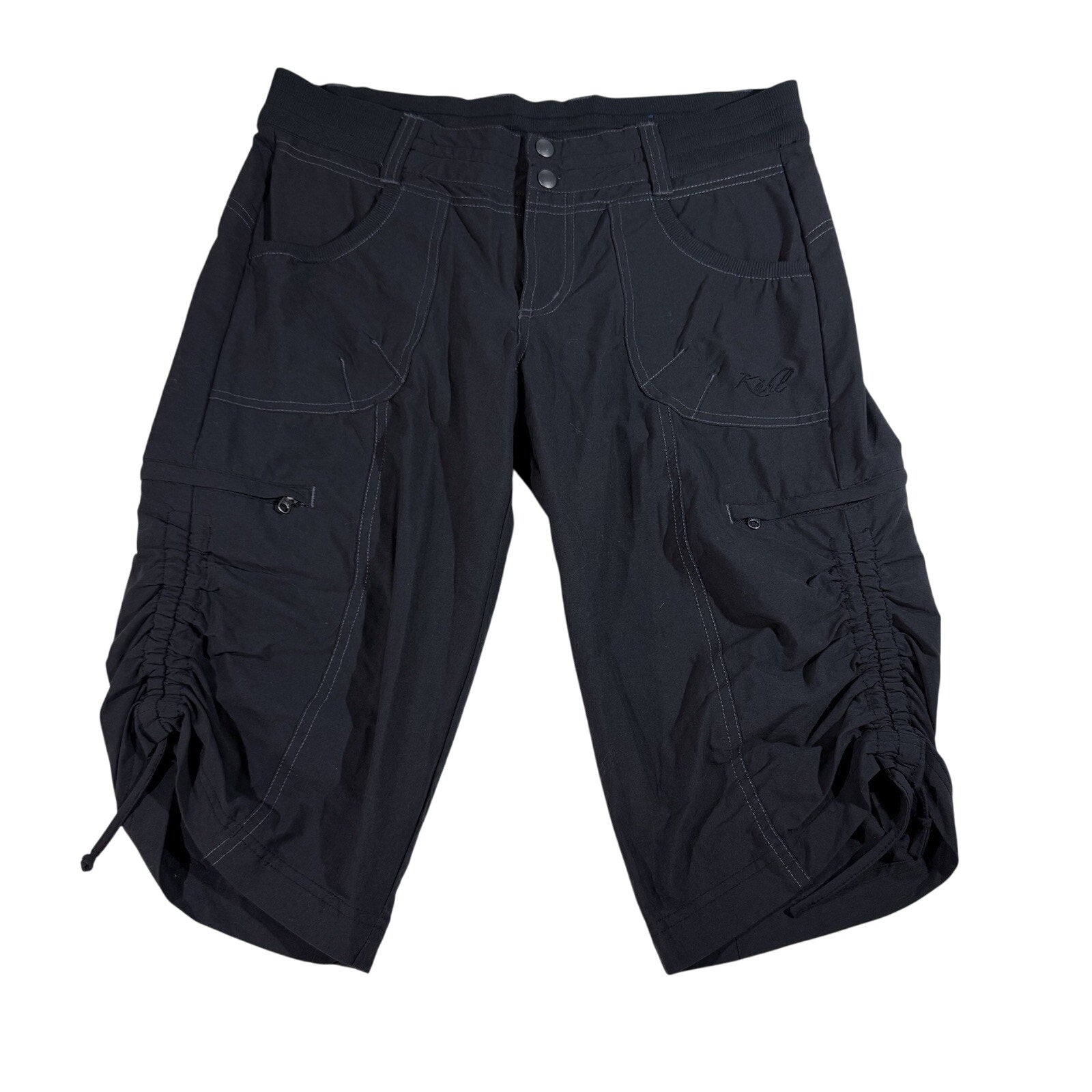 Pre-owned KÜHL women’s capri pants in size 6. Durable, lightweight, and designed for active outdoor wear. Black color with contrast stitching, cargo-style pockets, and side ruching with adjustable drawcords for a customizable fit.