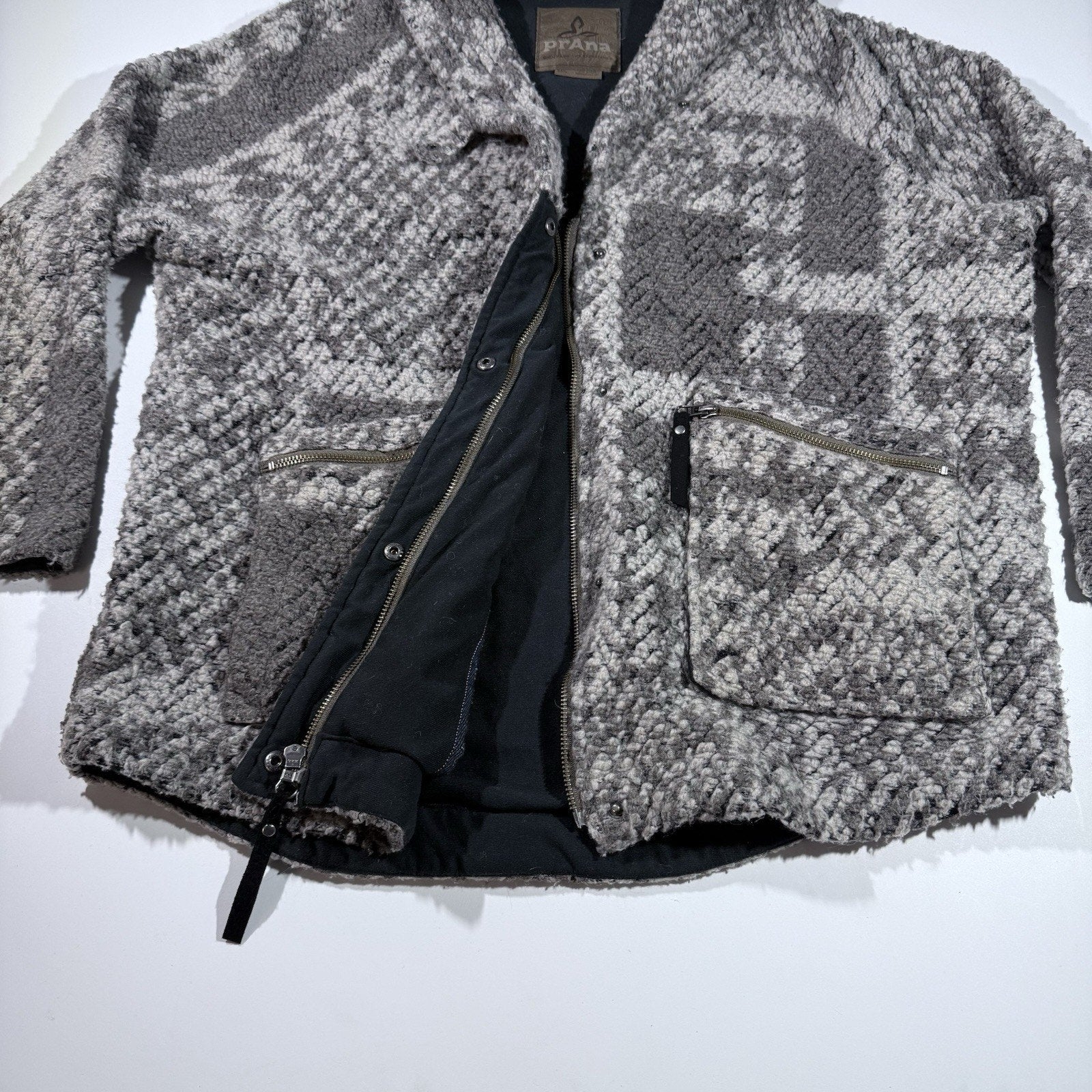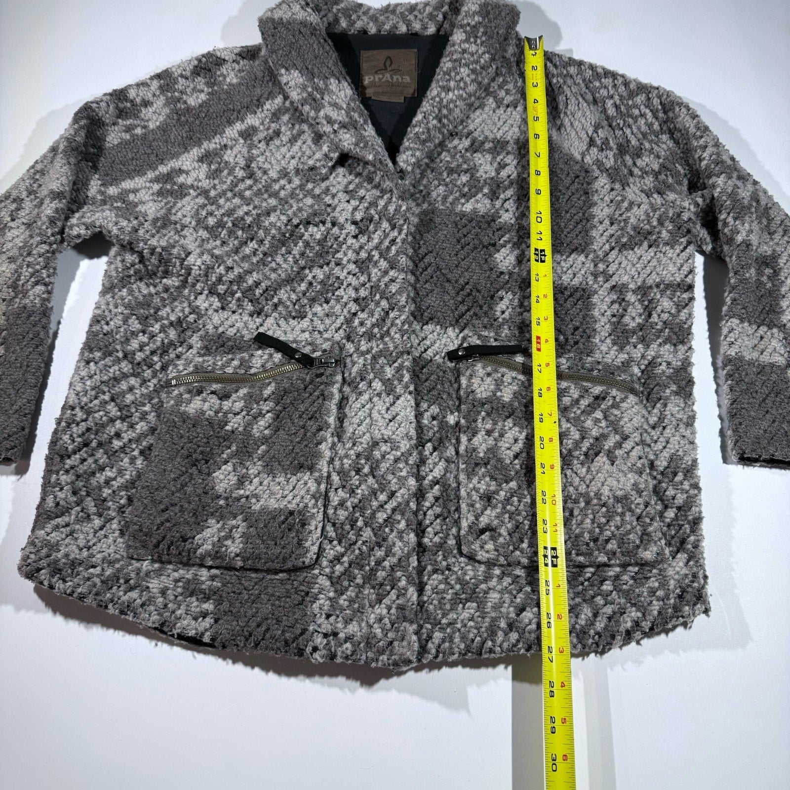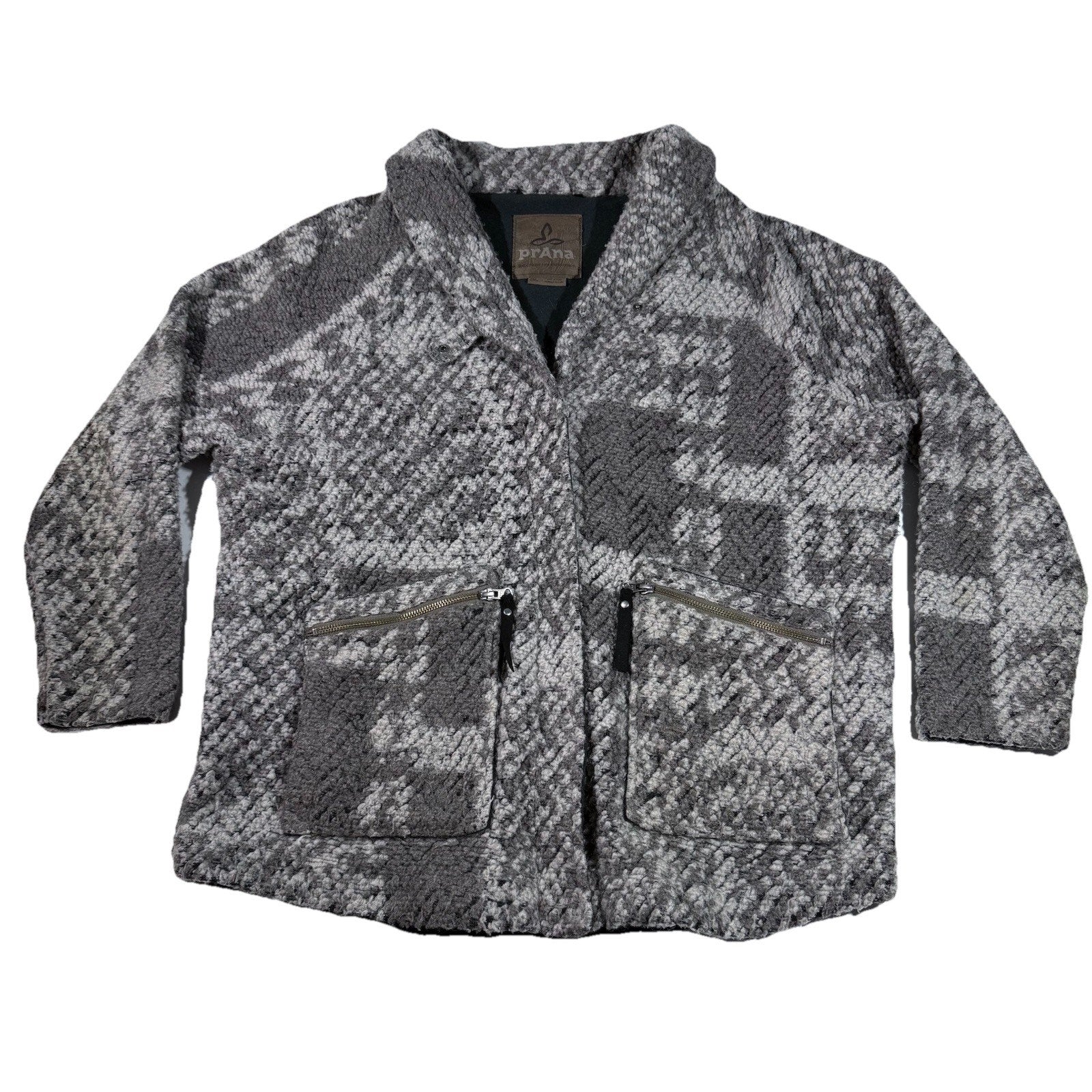Stay cozy and stylish with this prAna women’s jacket in size Small. Made with a warm wool blend, this gray knit jacket features a unique boho-inspired pattern, a full front zipper, and two large front zippered pockets. Perfect for layering on chilly days or adding a touch of rustic style to your wardrobe.