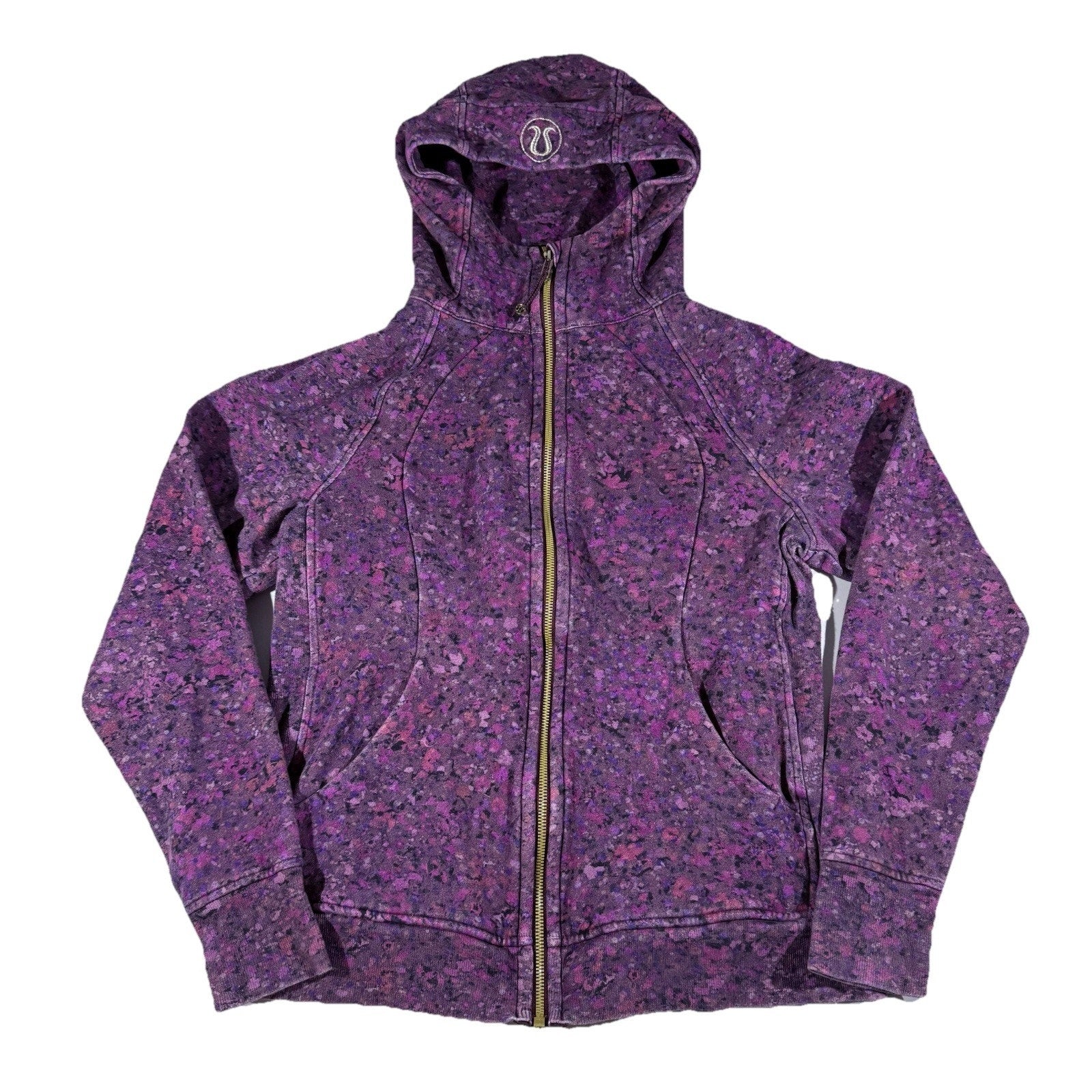 This is a RARE limited-release Lululemon Scuba Hoodie II featuring the hard-to-find Floral Spritz purple multi-color print. These painterly speckled patterns were produced in very small runs and are now highly collectible.