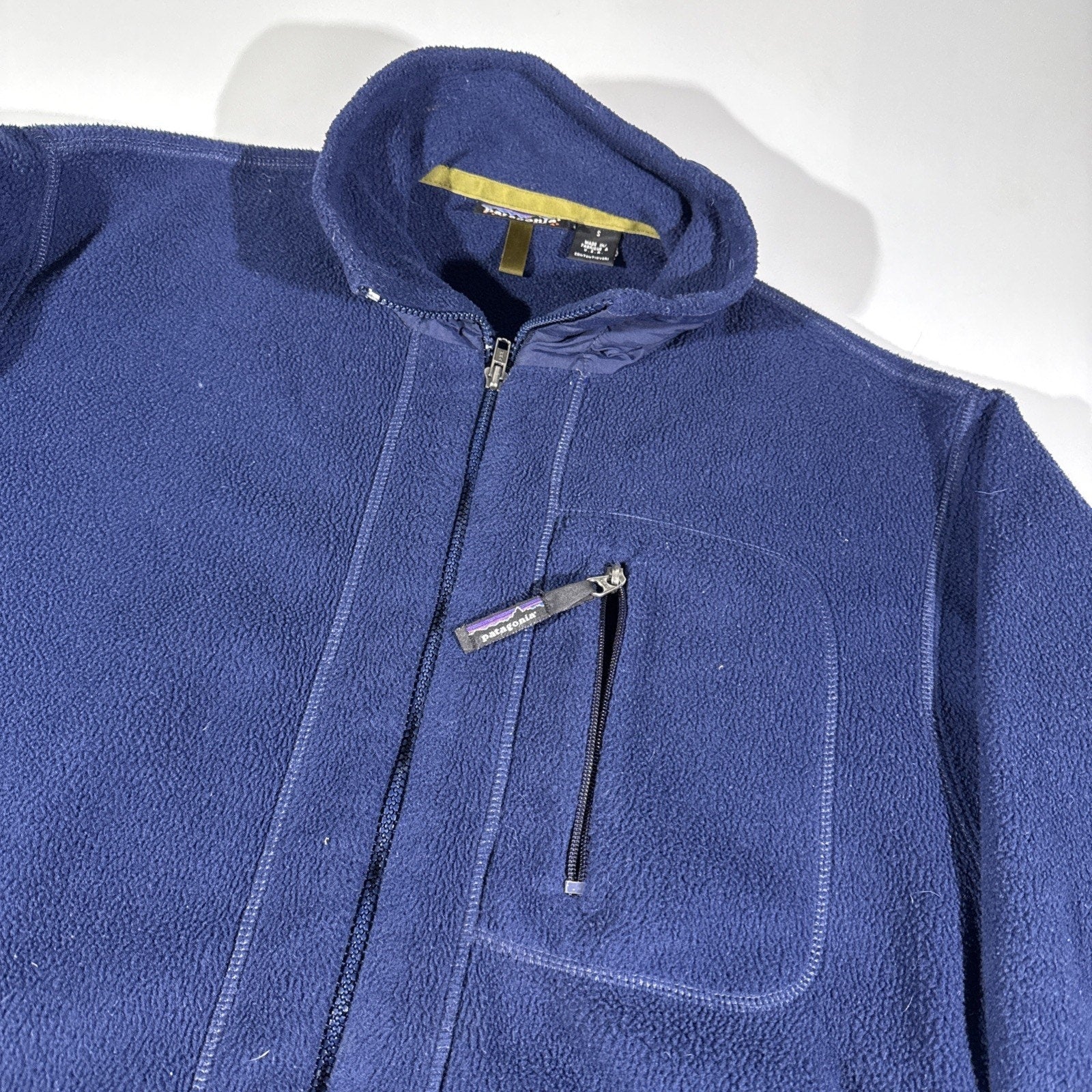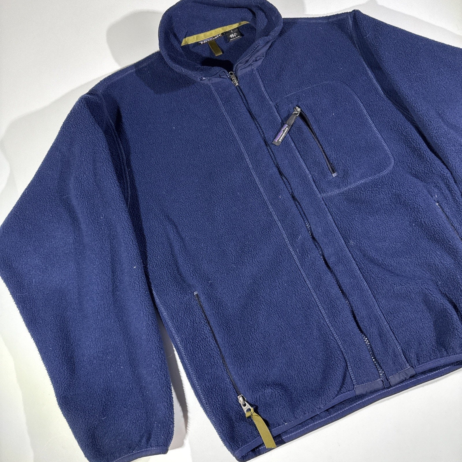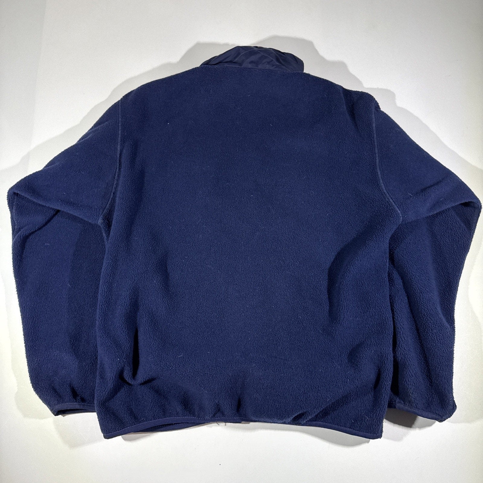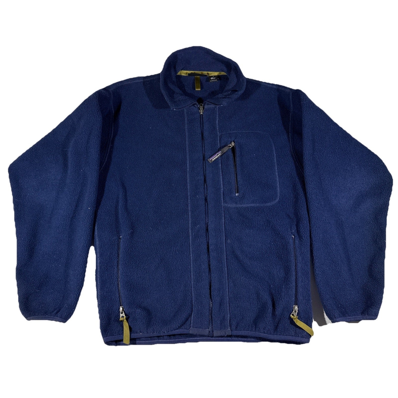 Classic vintage Patagonia Synchilla fleece jacket in deep navy blue, made in the USA — a rare find from Patagonia’s earlier production years. Known for its warmth, durability, and timeless outdoor design, this jacket is ideal for layering during hiking, camping, climbing, or everyday wear.